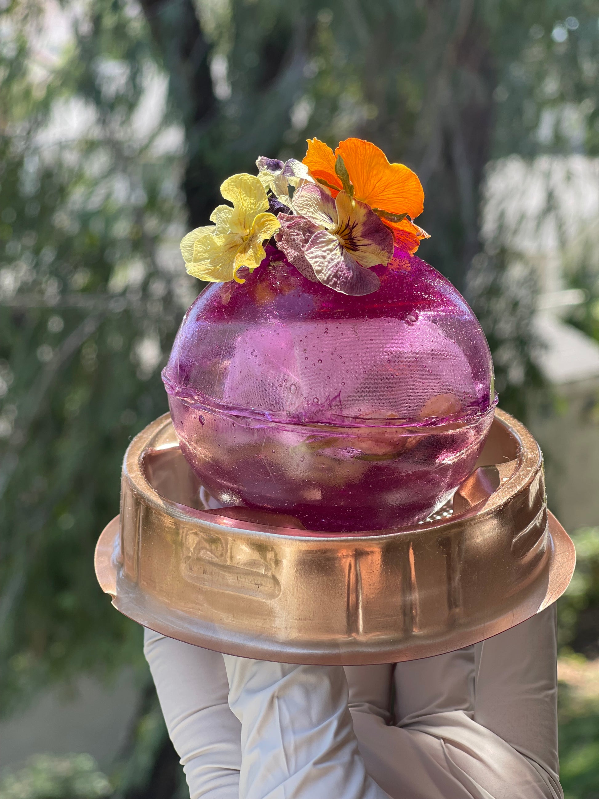 The tea bomb has beautiful flowers and edible glitter to decorate your tea with the tea inside the bomb.